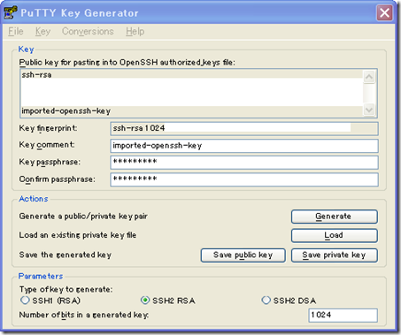 ssh-keygenで生成した、id_rsaキーをputtygen.exeにて開く。